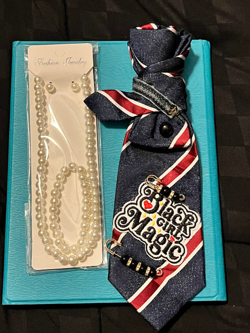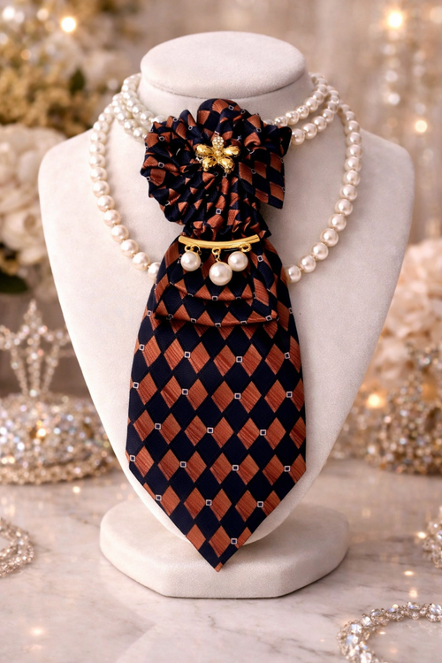 Shades of Blue knotted necktie with pearl and gold embellishments. Comes with 16” pearl necklace set to complete look.